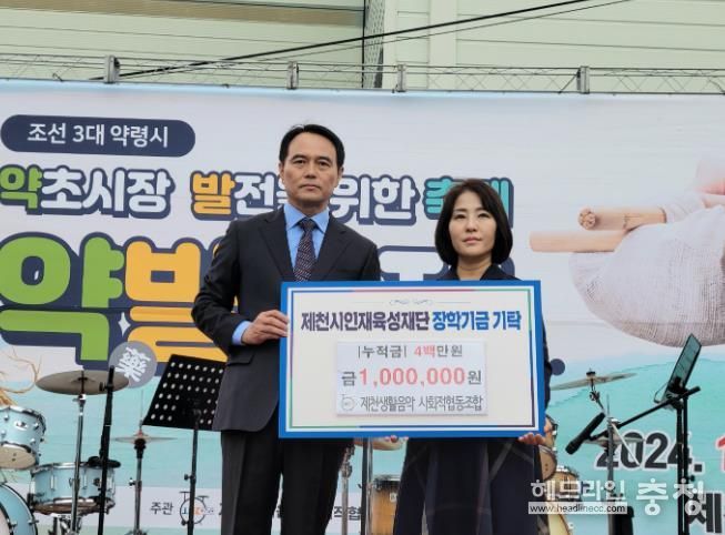 헤드라인충청 김용철 기자 | 제천생활음악 사회적협동조합은 지난 19일 개최된 약초시장 발전을 위한 축제인‘약발 축제’에서 제천시인재육성재단(이사장 지중현)에 문화 예술인재 양성을 위한 장학금 100만 원을 기탁했다.