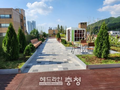 충북도청 신관과 동관에 위치한 하늘정원은 수목 50종과 초화류 6,800본을 식재하고 휴게시설과 포장 공사를 진행하여 노후된 청사 옥상을 새로운 힐링 공간으로 업사이클링했다.