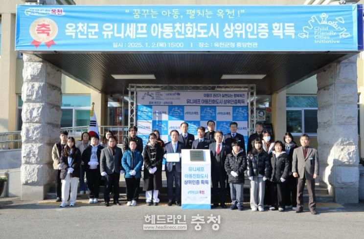 헤드라인충청 김용철 기자 | 옥천군이 유니세프 한국위원회로부터 ‘아동친화도시 상위 인증’을 획득함에 따라 2일 상위 인증 현판식을 열었다.