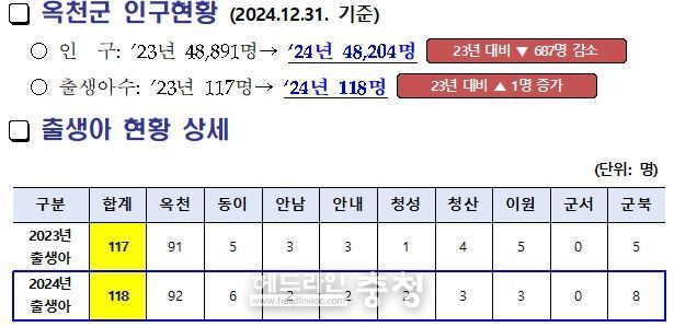 특히 옥천읍, 동이면, 청성면, 군북면에서는 2023년보다 많은 아기가 태어나 침체됐던 옥천군 인구 유입에 활력을 불어넣어 주었다.