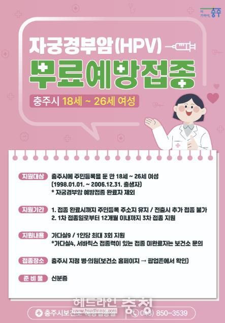 헤드라인충청 김용철 기자 | 충주시가 전국 지방자치단체 중 유일하게 자궁경부암 예방을 위한 ‘가다실9’ 예방접종 전액 지원 사업을 시행하며, 여성 건강을 선제적으로 지켜나갈 계획이라고 밝혔다.