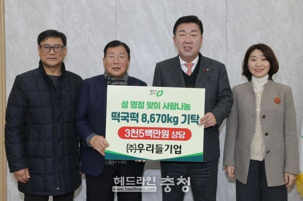 헤드라인충청 김용철 기자 | ㈜우리들기업(대표 이무석)은 설 명절을 앞둔 16일 청주시청을 찾아 지역의 어려운 이웃들에게 전해달라며 3천500만원 상당의 떡국 떡 8천670kg을 기탁했다.