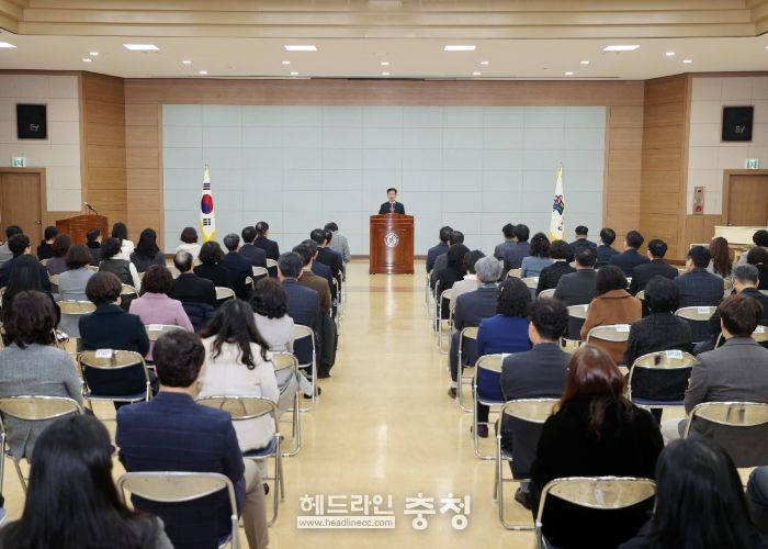 헤드라인충청 김용철 기자 | 윤건영 충청북도교육감이 3일, 화합관에서 2월 월례조회를 개최했다.