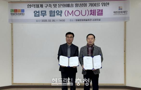 헤드라인충청 김용철 기자 | (재)제천문화재단과 (재)영월문화관광재단이 지역 문화예술 발전을 위해 지난 5일 영월문화예술회관 회의실에서 업무협약을 체결했다.