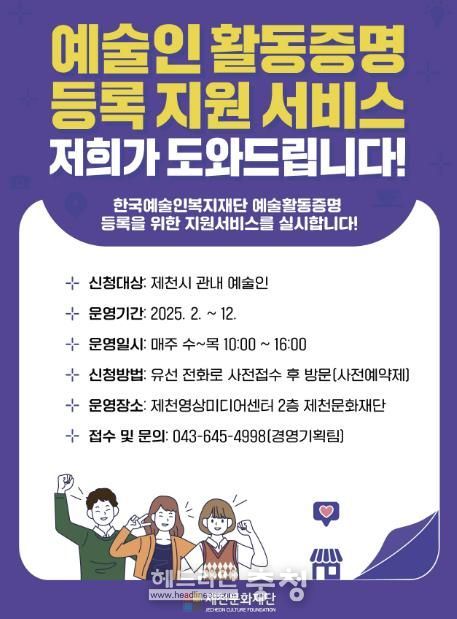 헤드라인충청 김용철 기자 | 제천문화재단은 지역 예술인의 복지 증진을 위해 ‘예술활동증명 등록 지원 서비스’를 2월 12일부터 매주 수요일과 목요일, 오전 10시부터 오후 4시까지 운영한다고 밝혔다.