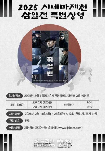 헤드라인충청 김용철 기자 | 제천문화재단이 삼일절을 맞이하여 오는 3월 1일 오후 2시와 오후 7시에 제천영상미디어센터 3층 상영관에서 안중근 의사의 의거를 다룬 영화 '하얼빈'을 무료로 상영한다.