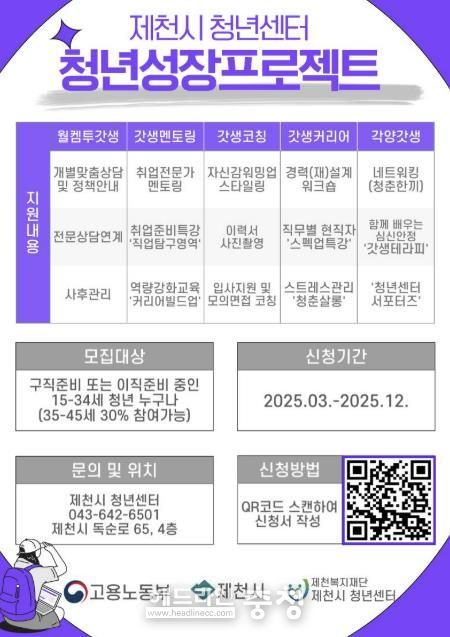 헤드라인충청 김용철 기자 | 제천시 청년센터가 2025년 고용노동부가 주관하는 공모사업에 선정돼 제천시 청년들의 구직활동지원을 위한 ‘청년성장프로젝트’를 추진한다.