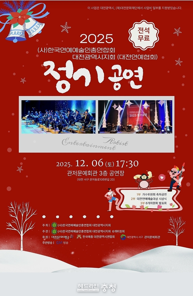 헤드라인충청 최병옥 기자 | (사)한국연예예술인총연합회 대전광역시지회(이하 대전연예협회)가 올 한 해 지역 대중문화 예술을 결산하는 ‘2025 정기공연’을 개최한다.