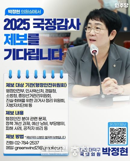 헤드라인충청 임용태 기자 | 더불어민주당 박정현 국회의원(대전 대덕구, 국회 행정안전위원회)은 9월 2일부터 온라인과 유선을 통해 국정감사 제보를 받는다고 밝혔다. 앞으로 진행될 국정감사를 앞두고 국민들의 제보를 받으려는 것이다.