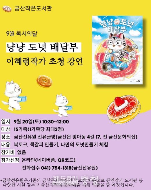 헤드라인충청 최주일 기자 | 금산작은도서관은 어린이들에게 신나게 책을 읽는 동기를 부여하기 위해 오는 20일 오전 10시 30분부터 금산선유원 선유글방에서 ‘냥냥 도넛 배달부’의 저자 이혜령 작가 초청 강연을 개최한다.