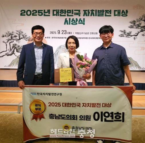 헤드라인충청 임용태 기자 | 충남도의회 이연희 의원(서산3·국민의힘)이 23일 백범 김구 기념관에서 열린 '2025년 대한민국 자치발전 대상' 시상식에서 광역의회 의원부문 수상자로 선정됐다.