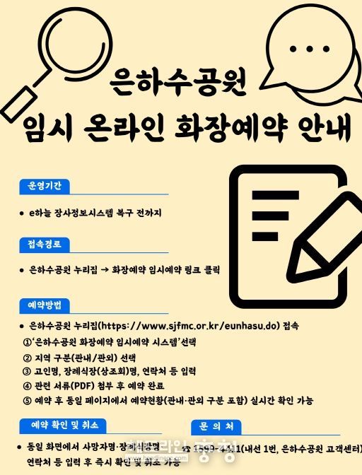 이용객은 은하수공원 누리집' 접속 후 ‘은하수공원 임시 화장예약 시스템’ 메뉴를 통해 고인명, 장례식장(상조회)명, 연락처 입력 및 관련 서류 첨부 절차를 거쳐 예약할 수 있다.