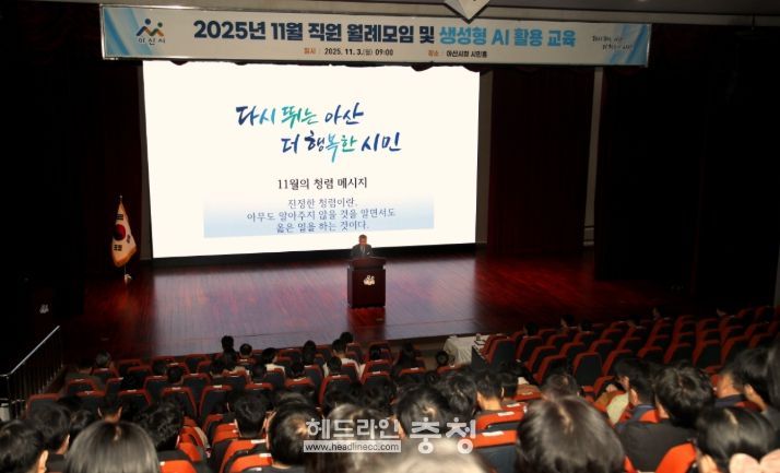 헤드라인충청 최주일 기자 | 아산시는 3일 시청 시민홀에서 11월 월례모임을 열고, 한 해 시정 마무리를 위한 향후 과제와 당부사항을 논의했다. 이날 월례모임은 오세현 시장의 해외 공무 일정으로 김범수 부시장이 주재했다.