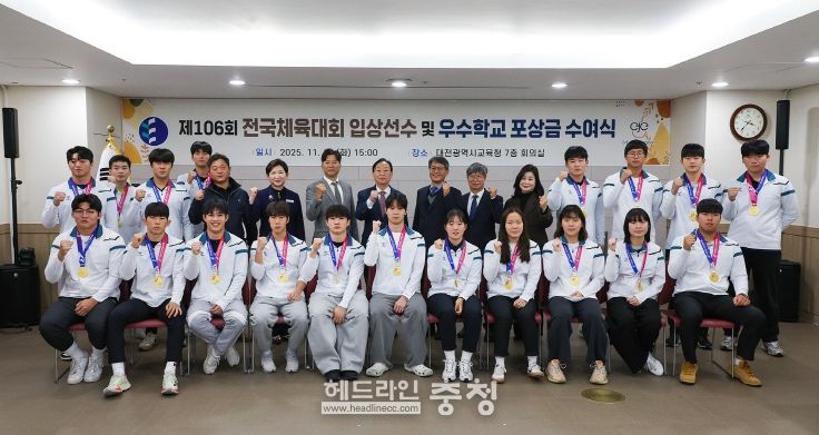 헤드라인충청 최병옥 기자 | 대전시교육청은 11월 18일 오후 3시 본관 701호 회의실에서, 지난 10월 17일부터 23일까지 7일간, 부산광역시 일원에서 열린‘제106회 전국체육대회 학생선수 메달 입상자 및 우수학교 포상금 수여식’을 개최했다.