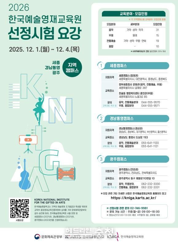헤드라인충청 권은숙 기자 | 한국예술종합학교 부설 한국예술영재교육원 세종캠퍼스가 내달 1일부터 4일까지 2026학년도 교육생을 모집한다.