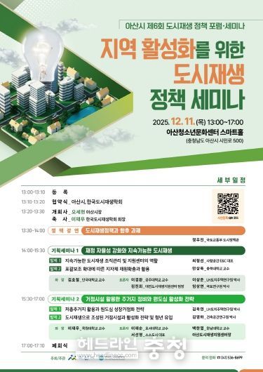 한편, 세미나는 누구나 참여할 수 있으며 자세한 내용은 아산시 도시재생지원센터 블로그 및 페이스북을 통해 확인할 수 있다. 신청은 전화, 포스터 QR코드, 방문 접수를 통해 가능하다. 시는 ‘2025~2026 충남·아산 방문의 해’를 맞아 시민들의 많은 참여와 관심 바란다고 밝혔다.