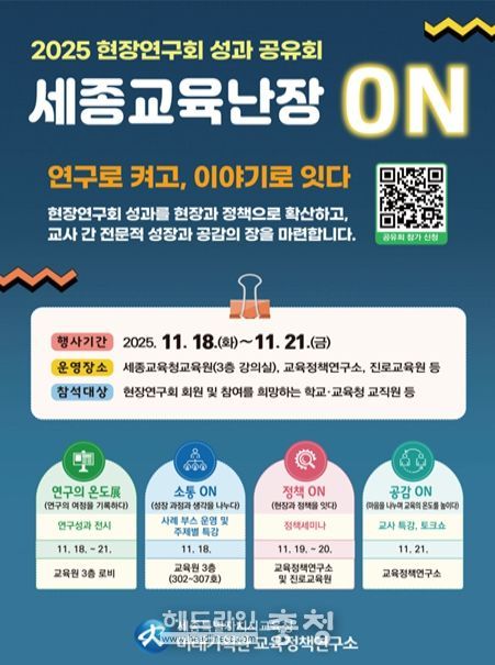 헤드라인충청 권은숙 기자 | 세종특별자치시교육청은 11월 18일부터 21일까지 4일간 2025년 현장연구회 운영 성과 공유 주간 ‘세종교육 난장-ON’을 운영했다고 밝혔다.