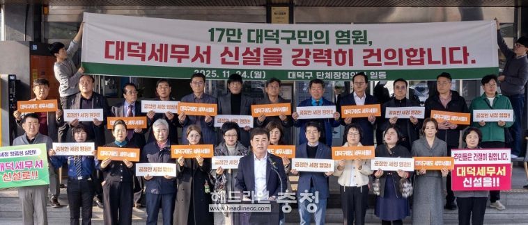 헤드라인충청 최병옥 기자 | 대전 대덕구는 대덕구단체장협의회가 24일 구청 현관에서 ‘대덕세무서(가칭)’ 조속 신설을 촉구하는 공식 건의문을 발표했다고 밝혔다.