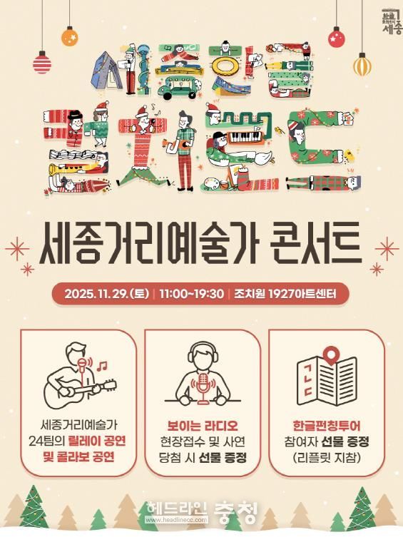헤드라인충청 권은숙 기자 | 세종시문화관광재단은 오는 11월 29일 오전 11시, 조치원읍 1927아트센터에서 ‘세종거리예술가 콘서트’를 개최한다.