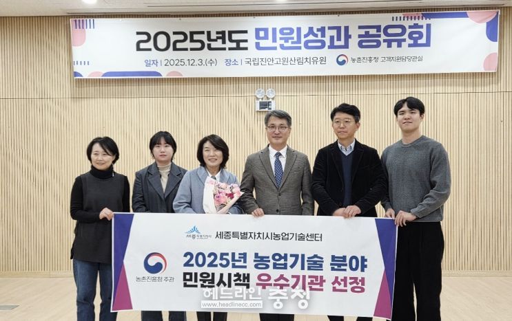 헤드라인충청 권은숙 기자 | 세종특별자치시 농업기술센터가 3일 농촌진흥청에서 주관하는 ‘2025년 농업기술분야 민원시책 우수기관’에 선정돼 농촌진흥청장 표창을 받았다고 밝혔다.