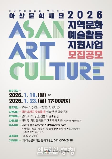 헤드라인충청 최주일 기자 | (재)아산문화재단은 지역 예술인의 안정적인 창작 환경을 조성하고 문화예술 생태계의 전문성을 강화하기 위해 ‘2026 지역문화예술 활동지원사업’ 공모를 시작한다.