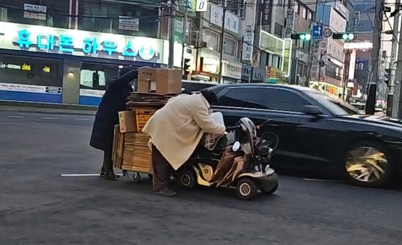 당시 현장은 어둠이 짙게 깔리기 시작한 시각으로, 허리가 굽은 한 할머니가 시동이 걸리지 않는 전동차에 폐지가 가득 담긴 핸드카트를 매달고 도로를 건너고 있었다. 신호가 바뀌고 차량들이 속도를 내기 시작하면서 자칫 대형 인명 사고로 이어질 수 있는 아찔한 상황이었다.