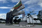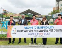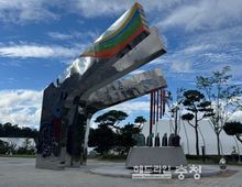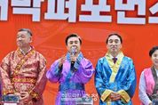 헤드라인충청 김용철 기자 | 영동세계국악엑스포조직위는 영동세계국악엑스포 개막과 함께 행사장 내에 설치된 상징조형물인 ‘전통의 울림, 미래를 울리다’의 제막식을 26일 개최했다고 밝혔다. 이날 제막식에는 국악엑스포 공동위원장인 정영철 영동군수, 윤영달 크라운해태 회장을 비롯해 민의식 국악 엑스포 집행위원장, 신현광 영동군의회 의장 등 주요 내빈이 참석해 자리를 빛냈다. 국악엑스포 상징조형물은 복합문화예술회관 옆에 높이 6미터, 세로 8.7미터, 가로 6.7미터 규모로, 금속 조각가 심병건 작가가 제작했다. ‘ㄱ’자 기울기에서 가장 맑은 소리를 내는 115도로 깎는 편경을 모티브로 하여 제작된 기하학적 구조의 세 개의 기둥은 국악이 지닌 맑고 청아한 울림을 형상화한다. 또, 음의 파동과 리듬으로 시각화된 율관과 한국 고유의 정체성을 의미하는 오방색 띠로 열린 세계를 향해 뻗어 나가는 에너지를 나타낸다. 세 개의 기둥과 함께, 중앙의 상단에 편종과 편경을 의미하는 파이프를 조형하여 ‘울림과 진동’이 이곳에서 시작돼 세상에 울려 퍼져나감을 표현했다. 16개의 편종은 관람객들이 각각을 두드려 직접 울림과 진