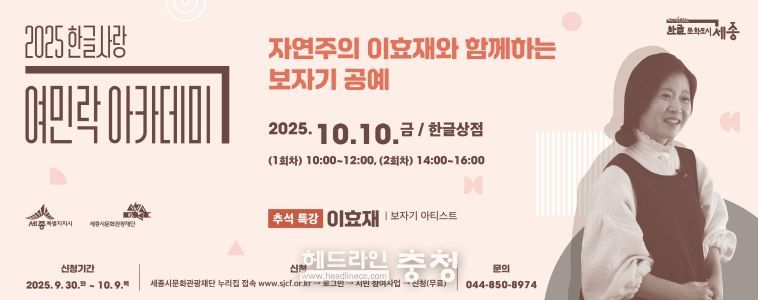헤드라인충청 권은숙 기자 | 세종시문화관광재단(대표이사 박영국)은 ‘2025 한글사랑 여민락 아카데미 추석 특별강좌’를 오는 10월 10일 진행한다.
