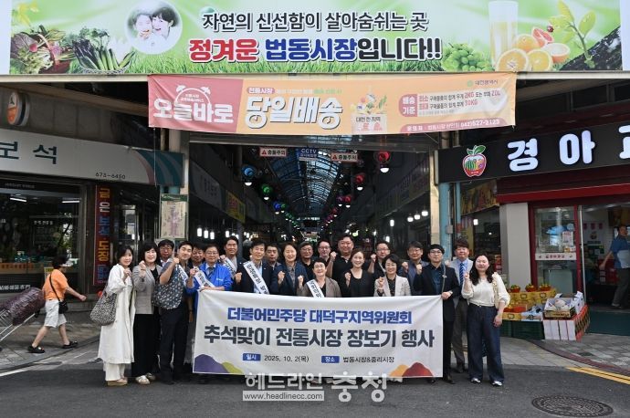 헤드라인충청 임용태 기자 | 더불어민주당 대덕구지역위원회(위원장 박정현 국회의원)는 당원들과 함께 민족 최대의 명절 추석을 맞아 10월 2일 대덕구 법동시장과 중리시장을 방문해 ‘지역경제 살리기 전통시장 장보기 행사’를 개최했다.