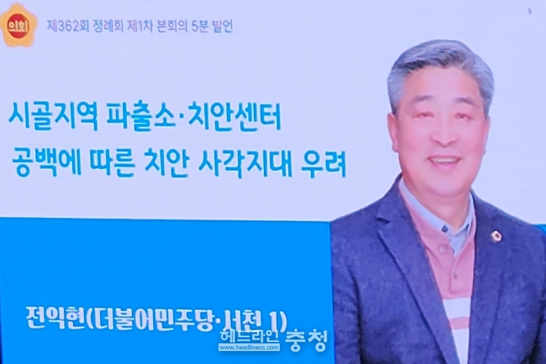 전익현 의원은 "이런 상황에서 인력이 적다는 이유로 치안센터마저 줄인다는 것은 주민 불안을 무시하는 결정"이라며 "충남도가 앞장서 농촌 지역의 치안 공백 해소를 위해 상주 경찰관 배치 확대와 인력 증원 계획을 중앙정부와 경찰청에 강력히 건의해야 한다"고 촉구했다.