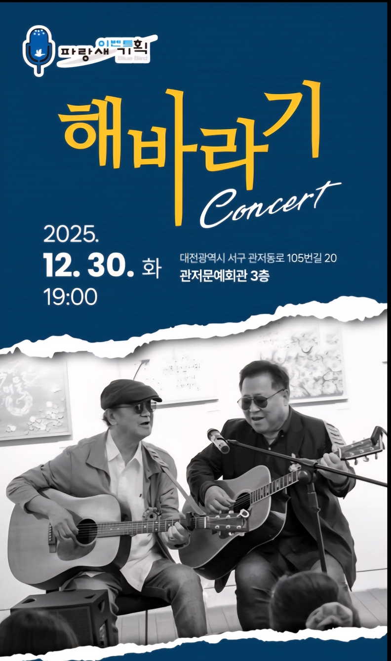 파랑새기획(대표 유하용)은 오는 12월 30일(화) 오후 7시 대전광역시 서구 관저동로 105번길 20 관저문예회관 3층에서 '음유시인'으로 불리는 1980년대 국내 최고의 남성 듀엣 '해바라기'를 초청해 단독 콘서트를 개최한다고 밝혔다.