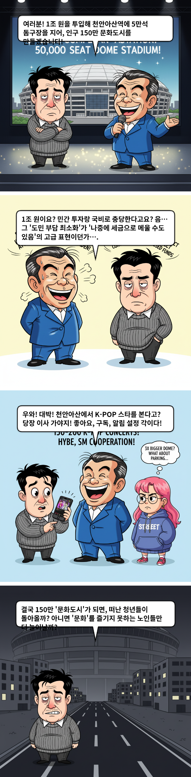 1조 원짜리 돔구장, 5만석 규모로 K-POP 콘서트까지? ️✨ 듣기만 해도 두근거리는데, 과연 이 모든 장밋빛 미래가 현실이 될 수 있을까요? 우리 동네에도 이런 초대형 프로젝트 계획이 있다면, 여러분은 어떤 점이 가장 기대되고 또 가장 걱정되시나요?