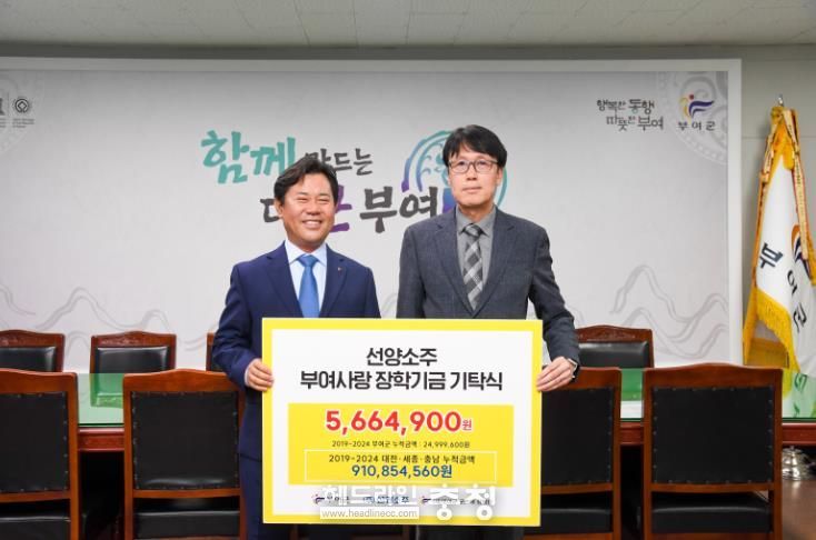 헤드라인충청 최주일 기자 | ㈜선양소주는 지난 26일 부여군청을 방문하여 인재 육성을 위한 장학금 566여만 원을 (재)부여군굿뜨래장학회에 기탁했다.