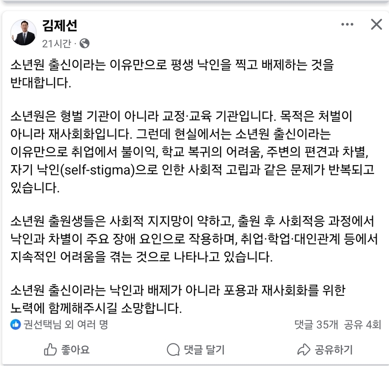 김 청장은 게시글에서 "소년원은 형벌 기관이 아니라 교정·교육 기관"이라고 정의하며, "목적은 처벌이 아니라 재사회화"임을 강조했다. 그는 현실에서 벌어지고 있는 취업 불이익 , 학교 복귀의 어려움 , 주변의 편견과 차별 등의 문제를 조목조목 지적했다.