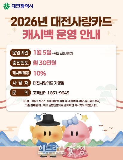 앞서 대전시는 2025년 421억 원의 예산을 투입해 7월부터 대전사랑카드를 운영했으며, 월 50만 원 구매 한도, 최대 13% 캐시백을 제공한 바 있다.