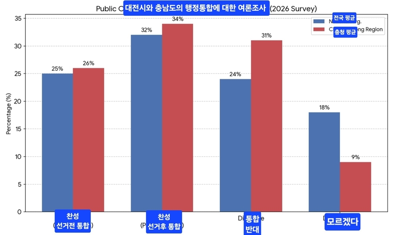 6월 지방선거를 앞두고 대전광역시와 충청남도의 행정 구역 통합 논의가 급물살을 타는 가운데, 국민 과반수가 통합 취지에 공감한다는 여론조사 결과가 나왔다. 다만 구체적인 통합 시기에 대해서는 당장의 선거 전 통합보다는 '선거 후 추진'을 선호하는 신중론이 다소 우세한 것으로 나타났다.
