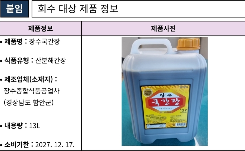 이번 회수 대상 제품은 경상남도 함안군에 위치한 식품제조·가공업체 '장수종합식품공업사'가 제조 및 판매한 '장수국간장(식품유형: 산분해간장)'이다. 문제가 된 제품은 13L 대용량 포장으로 생산되었으며, 소비기한이 ‘2027년 12월 17일’로 표시된 물량이 이에 해당한다.