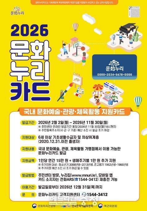 헤드라인충청 권은숙 기자 | 세종특별자치시가 내달 2일부터 소외계층의 문화 격차 해소를 위한 2026년도 문화누리카드 발급을 시작한다.