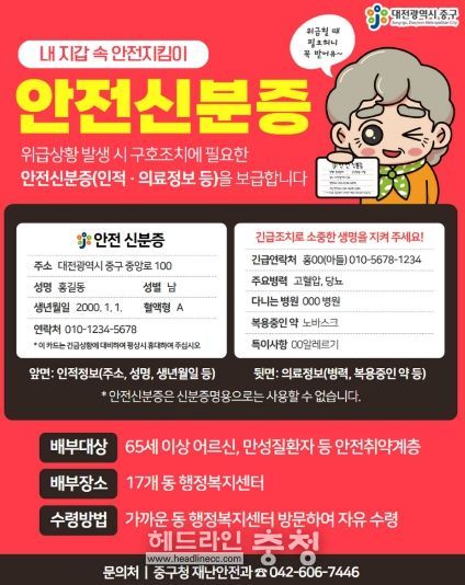 헤드라인충청 최병옥 기자 | 대전 중구는 위급상황 발생 시 신속한 구호조치를 돕기 위해 의료정보 등을 기재할 수 있는‘안전신분증’을 제작하여 각 동 행정복지센터를 통해 배부한다고 5일 밝혔다.