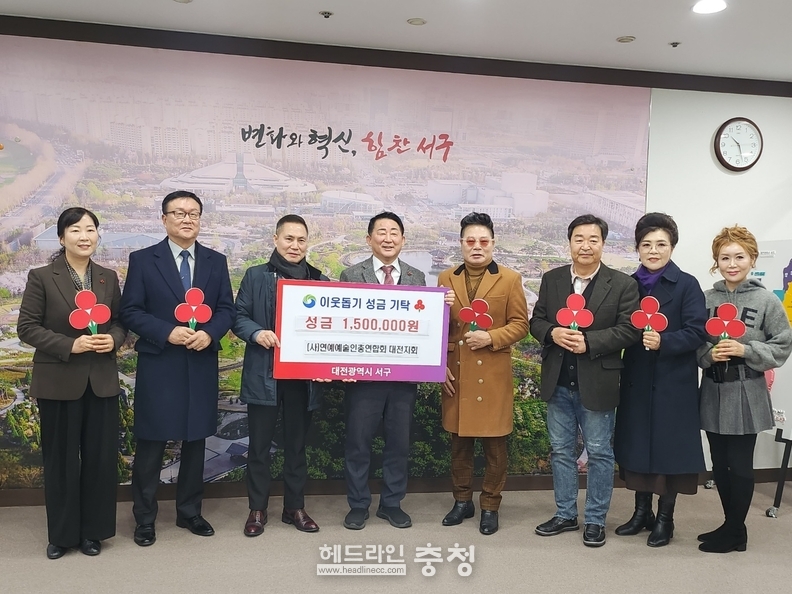 대전연예협회는 2월 4일 대전 서구청에서 성금기탁식을 갖고, 지역 내 취약계층 지원을 위한 성금을 전달했다. 이번 성금은 대전연예협회 산하 단체인 대전연예예술단이 주관한 「송년 나눔 음악회」를 통해 마련됐다. 해당