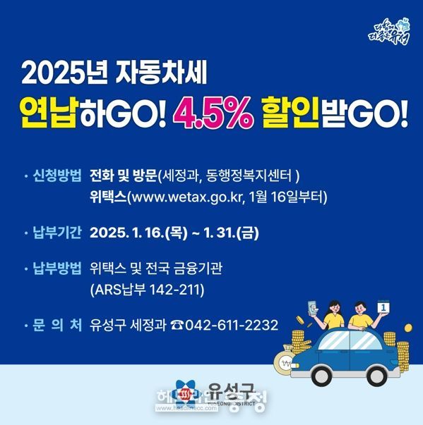 헤드라인충청 최병옥 기자 | 대전 유성구는 오는 16일부터 31일까지 1년 치 자동차세를 미리 납부하면 세액을 공제받을 수 있는 ‘자동차세 연납제도’를 운영한다고 밝혔다.
