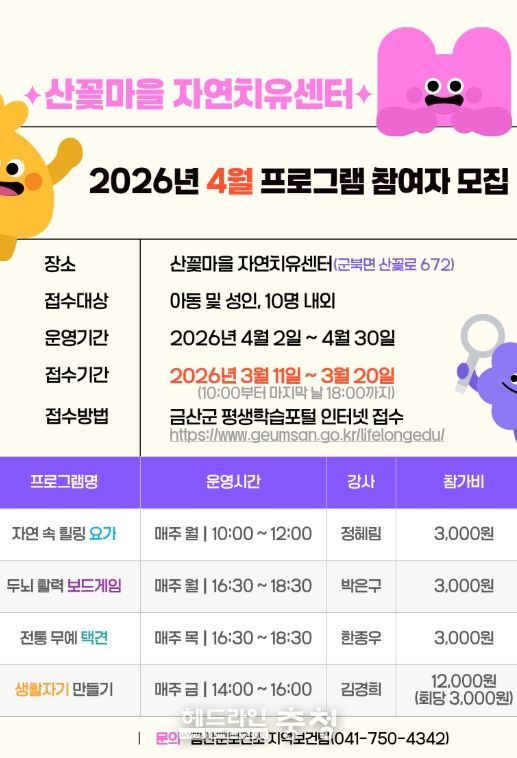 헤드라인충청 최주일 기자 | 금산군은 지역 주민의 건강 증진과 여가 활성화를 위해 3월 11일부터 20일까지 산꽃마을 자연치유센터 2026년 4월 프로그램 참여자를 프로그램별로 8명에서 12명까지 모집한다.