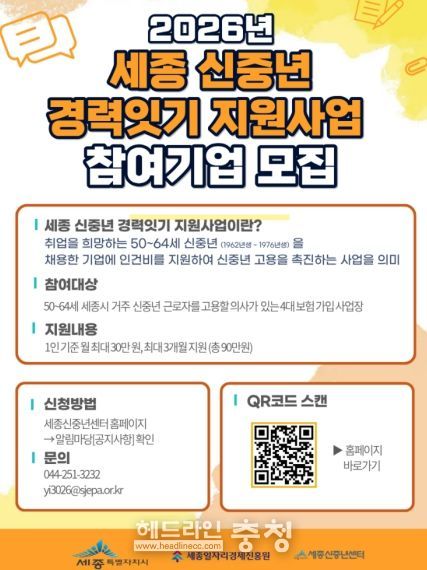 헤드라인충청 권은숙 기자 | (재)세종일자리경제진흥원이 ‘2026년 세종 신중년 경력잇기 지원사업’(이하 ‘경력잇기 지원사업’) 참여 기업을 모집한다.