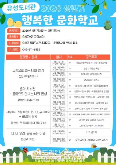 헤드라인충청 최병옥 기자 | 대전 유성구는 4월부터 7월까지 주민의 문화 향유 기회를 확대하고 정서적 치유를 지원하기 위한 ‘2026년 상반기 행복한 문화학교’를 운영한다.