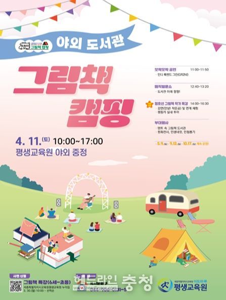 헤드라인충청 권은숙 기자 | 세종특별자치시교육청평생교육원이 오는 4월 11일 오전 10시부터 오후 5시까지 평생교육원 야외 중정에서 지역주민과 가족을 위한 특별한 독서 문화 행사 ‘야외 도서관 그림책 캠핑’을 개최한다.