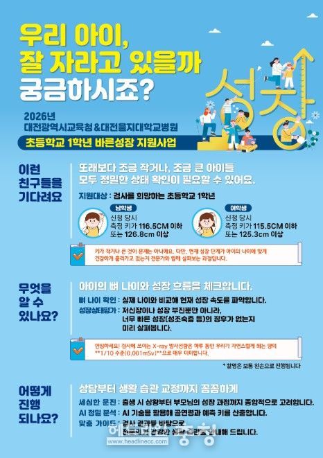이번 사업은 대전을지대학교병원이 참여하며, X-ray 촬영으로 골연령과 성장 속도 등 현재의 발달 상태를 확인한다. 또한 검사 결과를 바탕으로 의료진과의 상담을 통해 가정 등 실생활에서 활용할 수 있는 교육 자료를 제공하는 등 체계적인 성장 관리를 지원한다.
