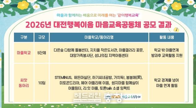 헤드라인충청 최병옥 기자 | 대전시교육청은 지역사회와 함께 성장하는 마을교육공동체 활성화를 위해 2026년 대전행복이음 마을학교와 씨앗동아리를 최종 선정했다고 밝혔다.