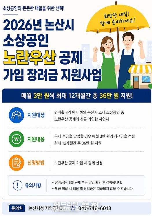 헤드라인충청 최주일 기자 | 논산시는 소상공인의 안정적인 경영 기반 마련을 돕기 위해 ‘2026년 소상공인 노란우산 공제 가입 장려금 지원사업’을 추진한다.