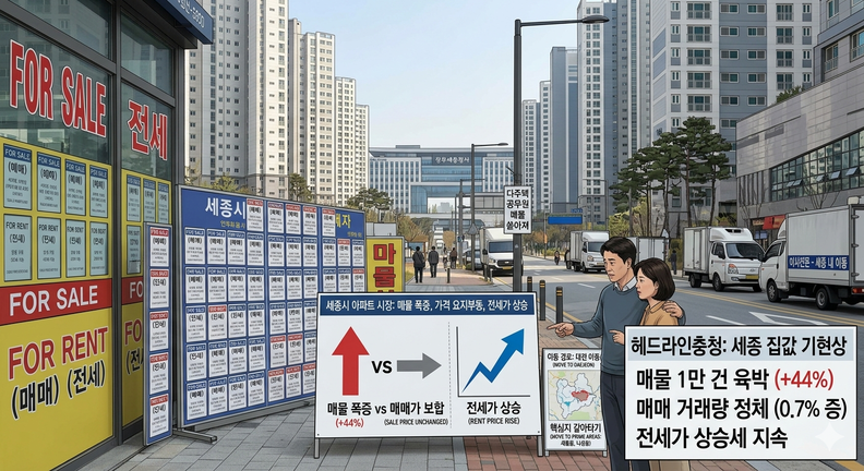 세종특별자치시 아파트 매물이 1년 새 44%가량 급증하며 1만 건에 육박하고 있지만, 매매가격은 떨어지지 않고 오히려 전세가격이 상승하는 기현상이 빚어지고 있다. 행정수도 이전 당시 유입된 외지인 투자자와 다주택 공무원들의 매도 물량이 쏟아지고 있으나, 급매를 피하는 매도자들의 '버티기'와 신규 공급 부족이 맞물린 결과로 분석된다.