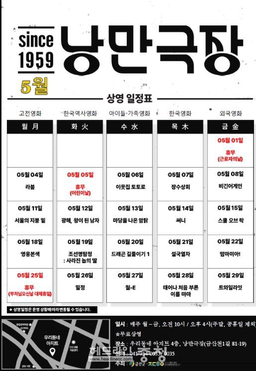 헤드라인충청 최주일 기자 | 금산군은 도시재생사업으로 조성된 우리동네아지트 4층 낭만극장에서 진행하는 5월 무료영화 상영을 안내했다.